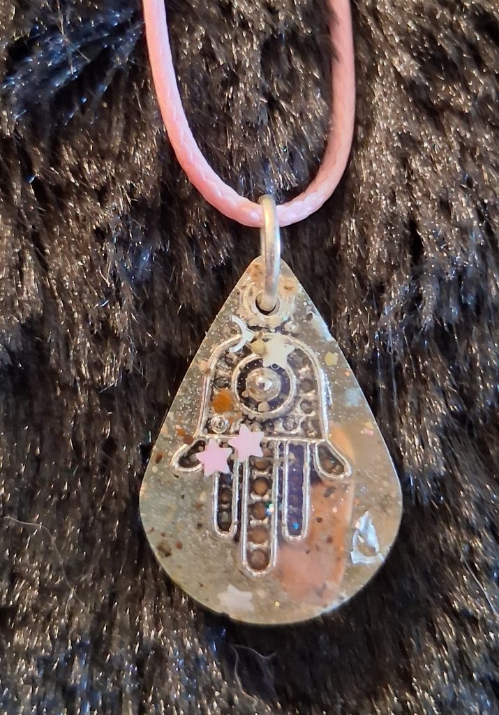 This beautiful Hamsa Hand necklace is the only one. It is made of resin and unique. Get it before its gone forever! https://square.link/u/hdriMQwY