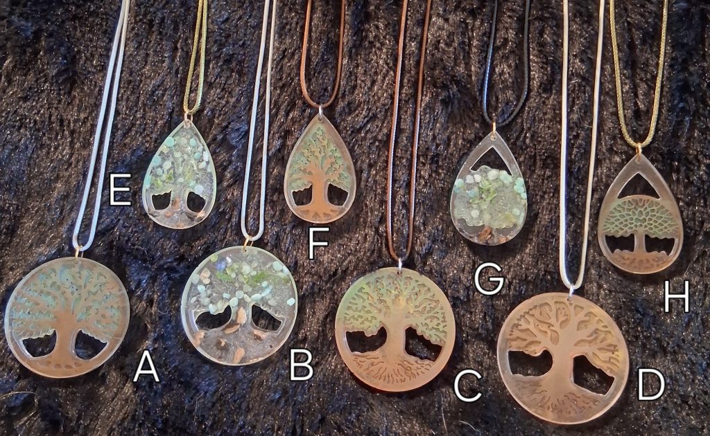 Theses Tree of Life necklaces are handmade resin some are filled with crystals for balance and grounding. Choose one from here or e-mail us for a custom order. https://square.link/u/2DhmChP8