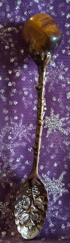 If you want a slightly larger spoon Check out our square shop, this one is Tigers Eye, but we have other stones available! Approximately 3″ https://square.link/u/Nknoe3bd